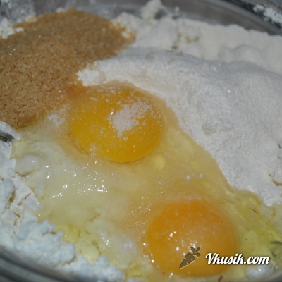 Добавляем яйца, сахар, ванильный сахар и щепотку соли