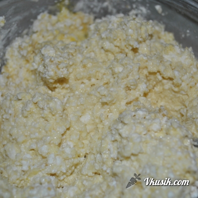 Творог хорошенько разминаем вилкой или перемалываем в блендере